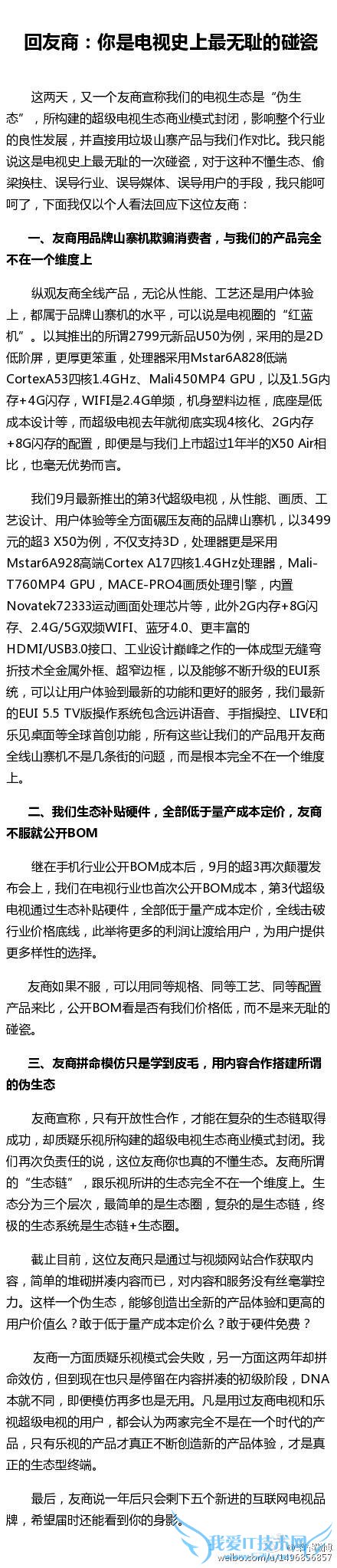 欢迎您访问我爱IT技术网,今天小编为你分享的是新闻资讯是:【大战小米之后乐视再与创维酷开对骂 反驳伪生态称对方为品牌山寨机】,下面是详细的分享!