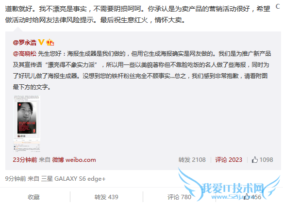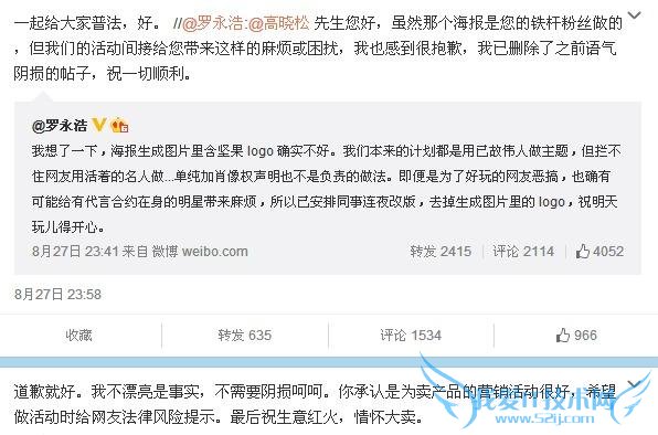 随后罗永浩微博进行委婉道歉,不过顺便嘲讽高晓松长得与海报文字说明不符。