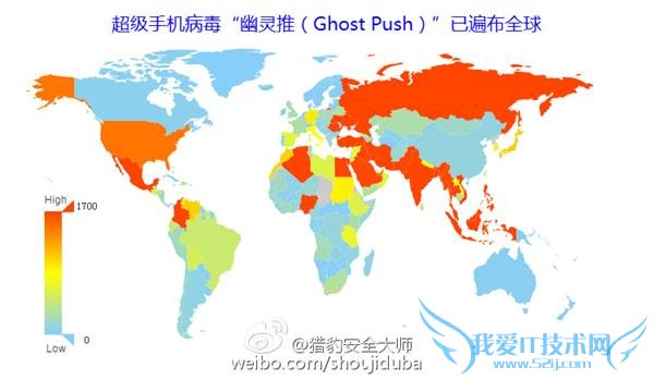 前瞻科技快讯,猎豹移动安全实验室今天发布紧急安全警报,一个针对安卓手机的针名为“幽灵推 (Ghost Push) 病毒正在大规模爆发,已经感染了全球 3658 个手机品牌 14846 款机型,每天就有超过 60 万手机重度,主要集中在中国、美国、印度、墨西哥等地,其中中国云南、广东等省尤为严重。