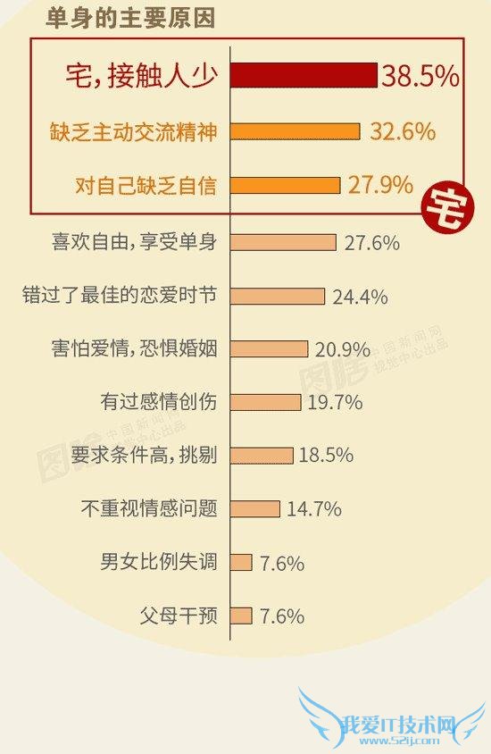 可以看出,单身人群中仅有 19.4%的人积极面对,另有 12.9%的享受单身,感到压力的人群占了 23.2%,而脱单相亲通过熟人介绍和和自己寻觅均超过 70%,可见要想远离单身一要靠人脉,二还是要看自己,在单身的成因中“宅”和缺乏自信等个人因素占据主要原因,所有还是不要抱怨这个世界,积极面对。