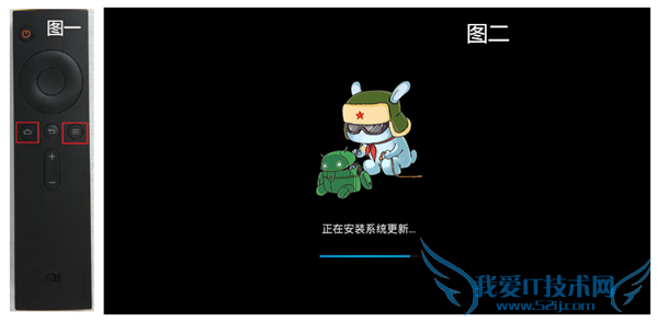 2、断开盒子电源,同时按住遥控器的“主页”和“菜单”键 (图一) ,平行对准盒子指示灯,接通盒子电源,直至出现图片所示刷机界面 (图二) ,出现画面后可以松开遥控器。