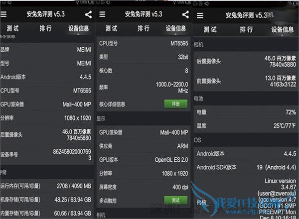 这款手机的名称叫魅米,也是让人不忍直视的名字,号称 5.5 寸 iPhone 同款 qHd 屏,八核 4G 内存 64G 存储,双卡双待 800 万像素,当然这些都当不得真。系统参数显示处理器为 MT6595 芯片,但 GPU 显示为 Mali400,很明显系统参数被修改过,按价格推测估计为联发科低端芯片方案,至于 4G 内存和 64G 存储之类的大概也是经过修改而来的。