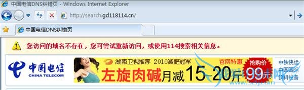 据业内人士介绍,网页劫持对网民上网危害极大,包括 DNS 劫持、默认搜索页劫持、空白页 (404) 劫持、捆绑定向弹窗广告等。实际上,许多网民可能早就遇到过。稍早的网页劫持来自电信、联通等宽带运营商。通过网页劫持,宽带运营商在用户上网时可以插入广告、修改浏览器设置等等。以下的广告就来自电信运营商:
