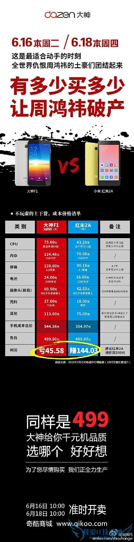 6 月 16 日消息,在频频向小米开炮之后,周鸿祎于今天选择和乐视一样,公布了大神 F1 极速版的物料价格,并且与红米 2A 作了对比,最后单方面宣布,大神 F1 是在亏本出售,完全让利给消费者;而红米 2A 则赚取暴利,并问消费者:还想继续送钱给小米吗?