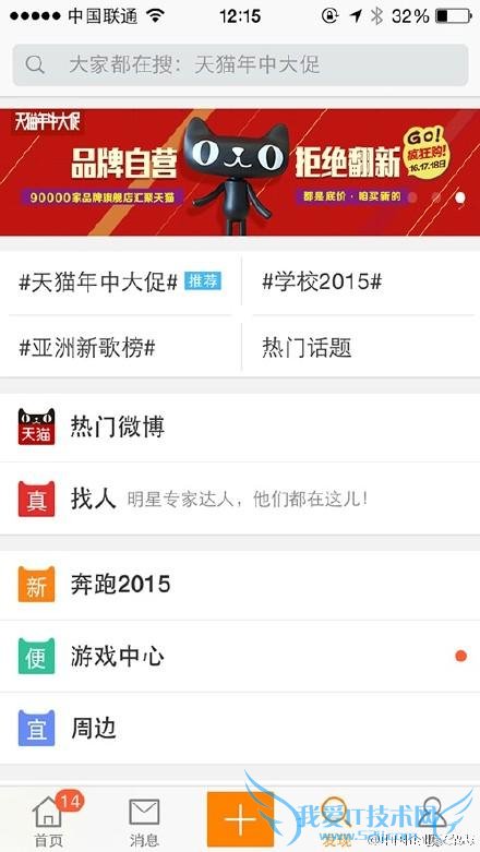 此外,在微博的手机端上,天猫也在发现频道的鲜明位置摆放了“品牌自营,拒绝翻新”的字样。以向公众传递天猫此次年中促销的机器为全新机。
