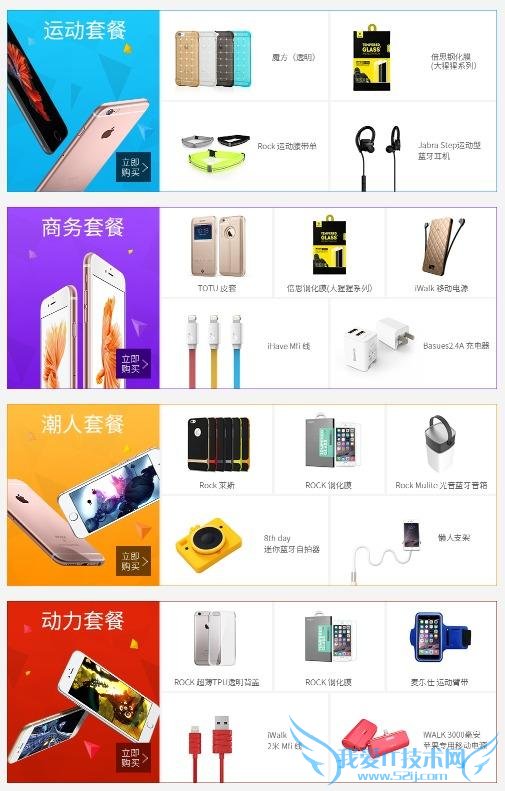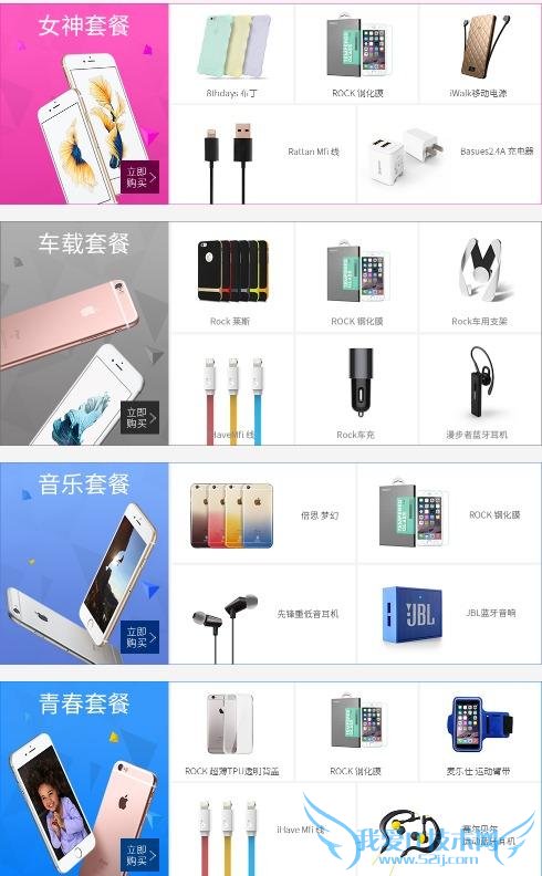 八个套餐分别是女神套餐、车载套餐、音乐套餐、青春套餐、运动套餐、商务套餐、潮人套餐、动力套餐,分别搭配贴膜、外壳、直接、音箱、移动电源等产品,套餐价格比原价高出数百元不等。套餐中的手机多是玫瑰金版和 iPhone 6S Plus,目前部分套餐也已经下架,但部分依然有货,其中包括玫瑰金版的 6S。