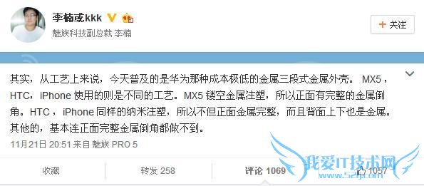 前瞻科技 11 月 22 日讯,金属外壳和指纹识别成为国产手机今年的主流,正在通过榜上阿里摆脱小厂商命运的魅族也不例外,前后发布了 MX5、Pro5、魅蓝 Metal 三款不同价位的金属手机,魅族副总李楠近日在微博公开抨击华为的金属工艺,认为其成本低,远远比不上自家的产品,然而此番言论并没有得到网友太多的认可。