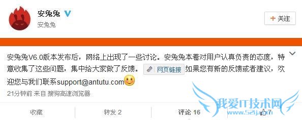 解答:安兔兔 V6.0 发布会的时间,是根据产品研发进度而来的,这跟海思发布芯片没有任何关系;安兔兔一直致力于评测体系的开放和公平,安兔兔 V6.0 版是与众多芯片厂商多次技术交流的成果。根据目前的测试结果显示,海思麒麟 950 在 V5.0 版本的测试成绩在 7.6 万至 7.9 万之间,在 V6.0 版的测试成绩相比 V5.0 版的成绩会更高,所以,安兔兔 V6.0 版本并不存在针对海思麒麟修复 BUG 的问题。也请不明真相的网友,不要再去散布不实言论。