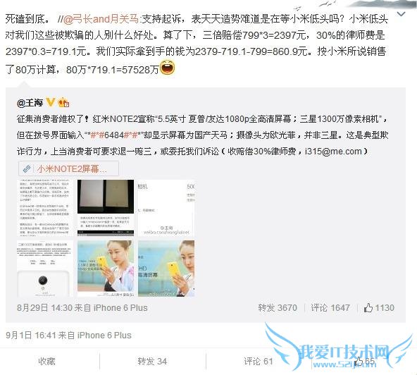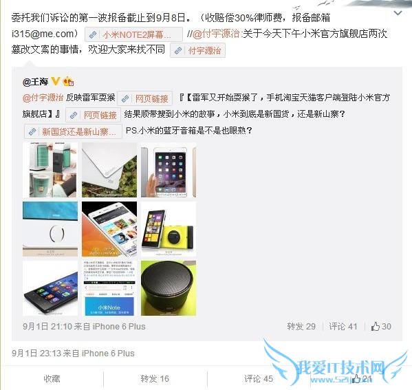 王海召集米粉的第一波报备截至到 9 月 8 日,收取赔偿的 30%律师费。除了红米 Note2 的问题,小米其它涉嫌虚假宣传的产品也被一一揪出,疑似通过造势拉拢更多的米粉。