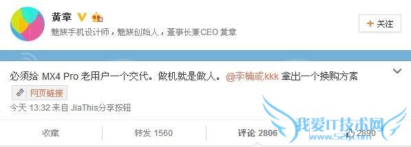 欢迎您访问我爱IT技术网,今天小编为你分享的是新闻资讯是:【老魅友喜极而泣 黄章微博发话MX4 Pro可换购Pro5】,下面是详细的分享!