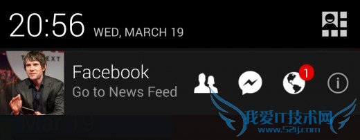 现在Facebook正在测试在通知栏中持续显示用户的状态,目前已经有包括待办事项和天气等一批应用实现了这个功能。Facebook的想法是把那些最重要的按钮留在用户的通知栏中,这些按钮分别是信息流、好友申请、消息和通知,另外还有一个可以关闭此功能的选项按钮。