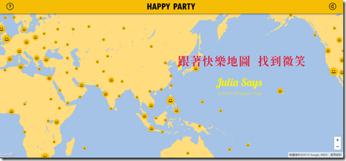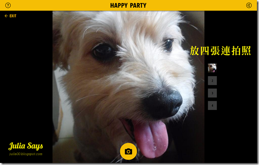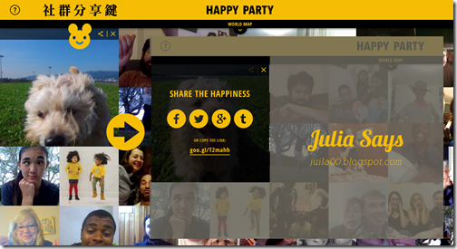 今年联合国跟 Google 合作一个名为 《Happy Party》的活动,进入网站会听到《Happy》这首去年疯狂一整年的歌,下方有 Join 的黄色按键,可以上传你最喜欢的四张照片,自拍为大多数,我放上我家狗儿照片。一定要放够四张,最后才会变成 GIF 动画图片。按下打勾,就完成你的派对欢乐照。