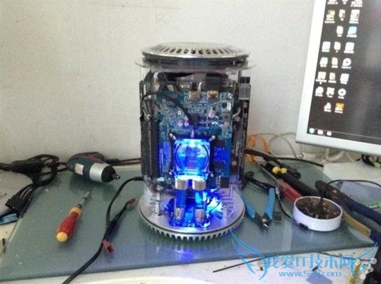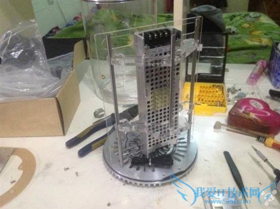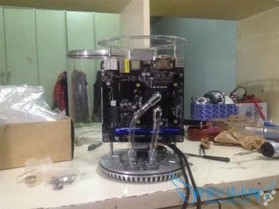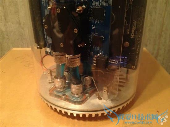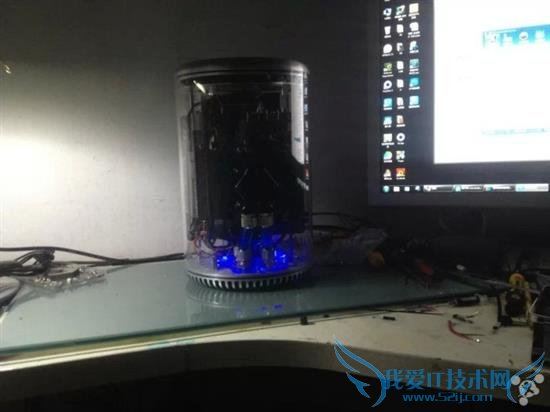 打造出来的仿Mac Pro主机的外径180mm,高度280mm。底座集成了水路和水泵,水泵采用了Alphacool DC-LT,而电源则采用了200W LED开关电源配合150W DC-ATX直插式电源的组合方案。主机外壳采用了易于加工的亚克力材料,机壳+电源+水路算下来成本在1300元左右。