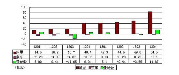 现在以亚马逊、京东和阿里巴巴净利润做对比,阿里巴巴2013年第四季度营收84.6亿元,同期京东亏损1.1亿元,亚马逊净利为14.87亿元,阿里大幅领先。