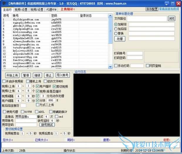 这个是我一直推荐的。因为网络营销如果量做不起来效果是不明显的。然而量要做起来除了找人之外,最省事的办法就是利用软件。您可以利用软件全自动、全天候并且大批量地上传视频。一天上传几百个视频是轻轻松松的事情。而且只要软件在运行就会一直地传,解放您的双手也大大节省了时间。如果运用得当,您的视频数量和覆盖率都能轻松做起来,倍增视频营销的效果。这类软件市面上都比较少,这里可以为您推荐一款我之前一直使用的软件——【海传燕优酷视频批量上传专家】。