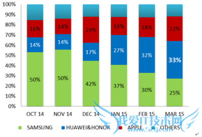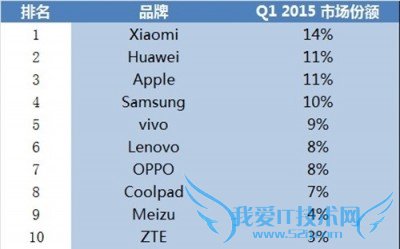 (图1:IHS Technology公布2015年Q1中国智能机市场份额)