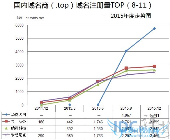 通过观察上述4家域名商.top域名注册量2015年走势,可清晰获悉在下半年,华夏名网.top域名曲线陡然上升,增速最快,排名随之上涨,是后来者居上的成功典型。另外3家域名商的.top域名曲线走势较为一致,彼此竞争激烈,注册量相差无几。