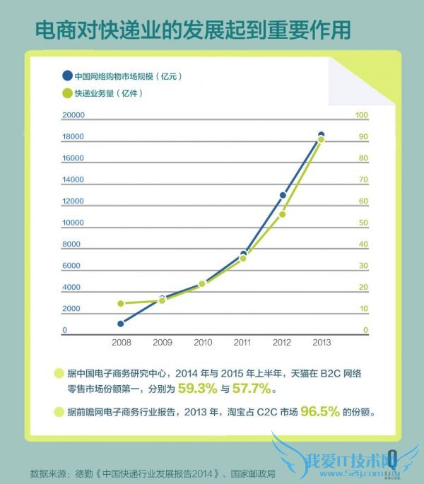 中国快递业近 4 年来高于 50% 的业务增长速度,都得益于电商的发展。而在中国的电商市场中,阿里巴巴又占到了绝对多数的市场份额。根据中国电子商务研究中心的数据,2015 年上半年,天猫在 B2C 网络零售市场的份额为 57.7%。C2C 方面,来自前瞻网电子商务行业报告的数据显示,淘宝占到了该市场 96.5% 的份额。