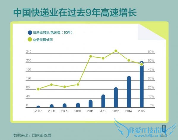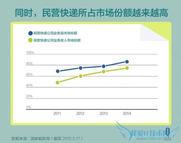 快递从业人员的增长得益于中国快递市场在过去 9 年间的高速增长。在 2011 年至 2014 年间,中国快递业务量的增速连续四年维持在 50% 以上。根据国家邮政局的统计,民营快递公司在中国快递市场的业务量市场份额由 2011 年的 67.6% 增长到了 2014 年的 85%。
