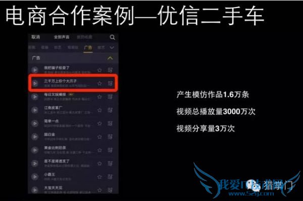 当时优信二手车在《中国好声音》做了广告的投放,为了造势选择了小咖秀来配合他们进行传播。当天应该上线了没几天,产生了1600多条视频,成绩效果还不错。大家如果对小咖秀这种商务的合作,或者品牌的推广感兴趣的话,也可以学习一下。