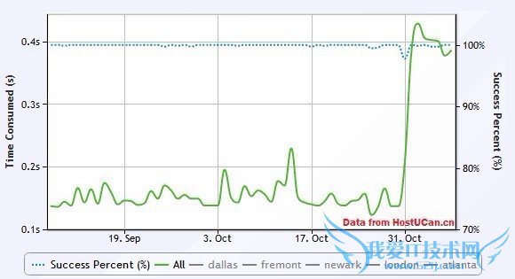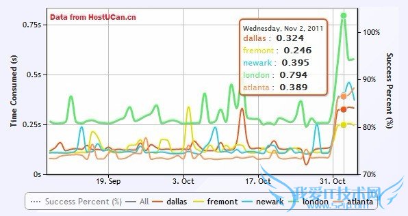 还是上一个网站,这一次,图中绿色实线为五个监测点的平均访问速度的变化。为了测试,在10月31号的时候,将站点由美国服务器转到了Linode日本的服务器。统计图中,明确的显示了这次迁移对服务器访问速度的影响(图中右侧突起)。