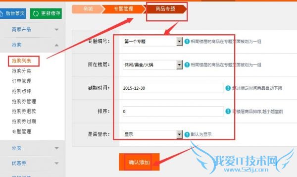 4、抢购商品专题添加,抢购商品还可进行专题添加,选择相应的抢购专题,确认添加完成之后,相应的抢购活动专题页面即可展现。