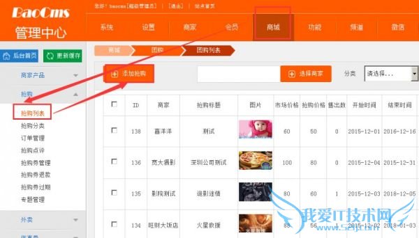 抢购是指在某一个时间段内商家低价甚至免费销售商品,消费者突发性的集中投入购买力,大批量的、超常规的购买某种或某类商品的现象。抢购功能是BAOCMS一大重要功能,是商家发布商品的主要平台,也是用户获取商品的主要渠道。抢购列表即是BAOCMS抢购商品的列表,管理员可通过此项进行添加抢购信息、查找抢购信息、删除抢购信息、编辑抢购信息等操作。