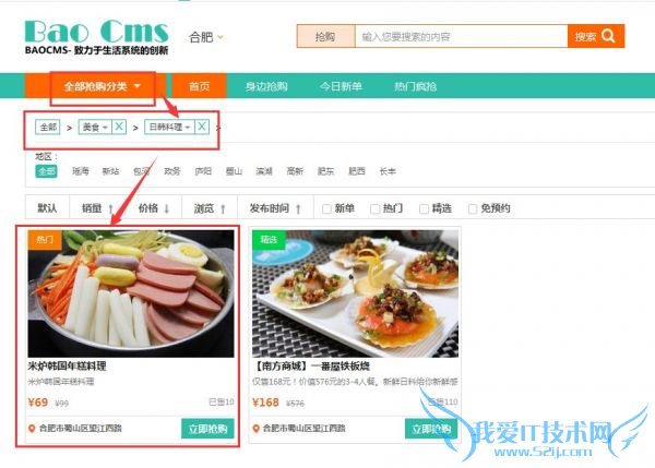 3、效果展现,抢购商品添加完毕之后通过审核,即可在抢购分类栏目下显示。