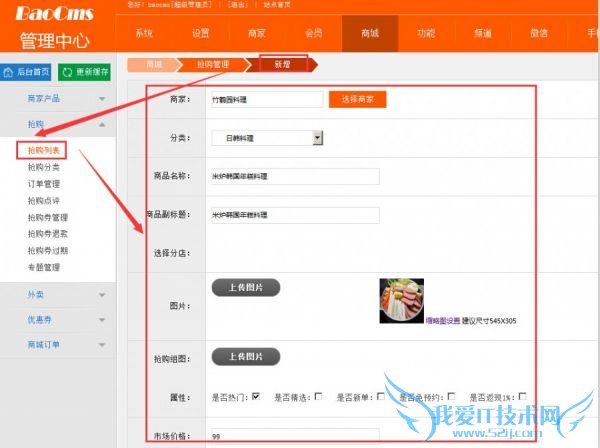 2、新增抢购信息,填写商家名称、分类、商品名称、图片、简介等信息,确认无误之后即可添加