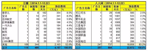 豆瓣与人人网Top10广告主,iAdTracker,2014