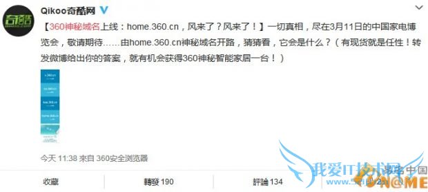 域名home.360.cn是由“家居”英文“home”和“360”组合而成的二级域名,登陆该域名页面仅显示为“风来了”三个字。据该微博消息,结果会在3月11日的中国家电博览会上揭晓。另外转发微博并给出你的答案,就有机会获得360神秘智能家居一台。该域名背后的产品会是什么呢?网友纷纷进行猜测。
