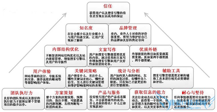 SEO的入门其实很简单,也至于很多人在看了网络上的一些知识就觉得自己会SEO了。事实上,一个成功的SEO项目并不是做垃圾站那样简单,本质是一套系统的过程,在操作过程中又渗透着各种细节处理。(垃圾站的处理过程其实不系统,没有真正SEO项目要考虑和注意的繁杂,所以能做垃圾站成功的人不一定能做好一个真正的SEO项目。)如何在这个系统过程中做好每一个步骤需要的不仅仅的SEO能力,还需要眼光和决策能力以及细节处理能力。下面这张SEO金字塔图简单介绍了这样一个系统的处理过程。