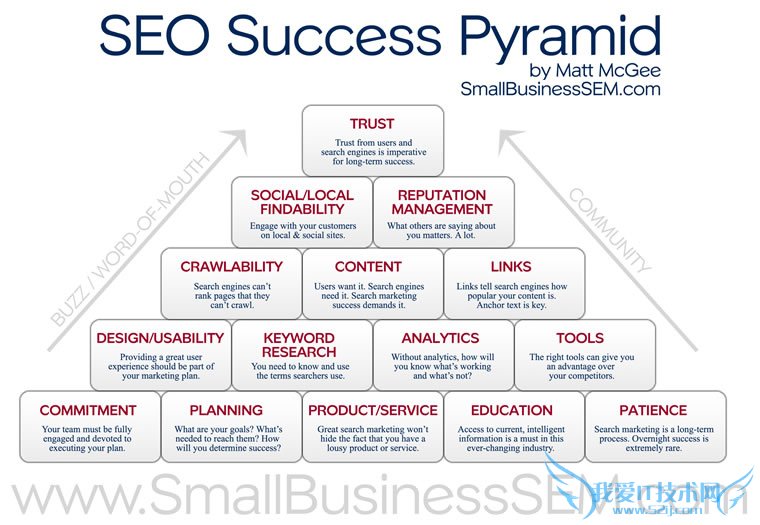 最近在老外SEO圈子里流行一篇文章,就是Small Business SEM的一篇名为SEO成功之金字塔模型(The SEO Success Pyramid)的文章。这篇文章主要归纳整套SEO项目最终获取成功所需要的一些支撑条件,并且总结成一张金字塔模型图。感觉这个模型图对SEO的人来说都有很好的指导作用,于是就把图篡改过来并对文字说明稍加改动。