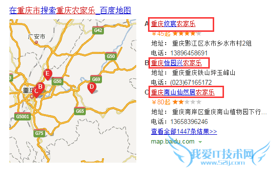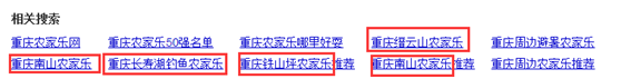 很多人可能不明白,搜索引擎的产品有什么用处呢?这里面大家可以去琢磨,也会发现很多问题值得去做,他们的产品都是大数据的产物,在用户体验和推荐内容上面都下了足够多的功夫。举个例子:我们在栏目也设置了“重庆农家乐”这个关键词,除了上面两种方法能推荐部分内容,但还需要大量的内容需要推荐,那么我们就借助百度地图,搜狗地图或者其他产品,来看他们推荐的什么内容就行了。