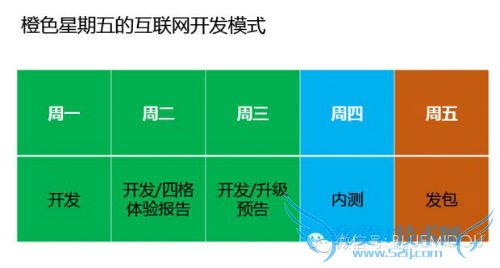 围绕口碑的核心理念,小米的MIUI的研发构建了“橙色星期五”的互联网开发模式,核心是MIUI团队在论坛和用户互动,系统每周更新,如下图所示,每周五集成开发版,用户升级体验,并在MIUI论坛进行投票,生成“四格体验报告”,这是来自用户对产品的最直接的评价。