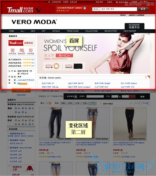 屏幕宽度1024的用户似乎已经在20%以下了,如果你认为可以忽略这一部分用户,可以不用关心下面的内容。天猫的店铺相关页面的默认宽度为990,但是店铺装修系统开放了样式自定义的功能,因此很多用户,开始在店铺页面的设计中使用,“挂耳朵”的方式(如下图)