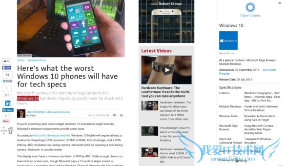 Cortana也内置在了Edge里。你可以选中单词或者短语,然后右键询问Cortana,一个侧边栏会从右侧划入,本质上是一个提供帮助的网页。微软此前在Office上进行过类似的做法,而这也是一个很有用的工具。