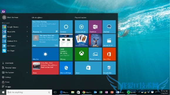 这是Windows 10上的新功能。点击左下角Windows的标志,或者按下键盘上的Windows键。新的开始菜单体验就会呈现,它综合了Windows 7和Windows 8的特定。你可以在左侧找的你最常使用的程序,右侧呈现了Windows 8一样的磁贴。动态磁贴周期性地翻转,刷新内容。