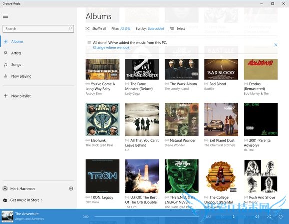 尽管微软渐渐不再使用“Xbox” 这个词来命名其音乐功能,这个音乐app基本上与win8版本的音乐器相同。如果你没有登录的话它首先会让你登录,然后再极短的时间里显示你的音乐列表里的音乐——远比win8的速度要快很多。