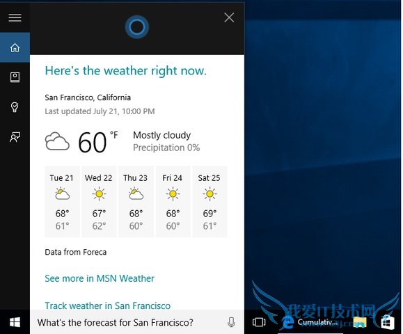 Windows 10上最具意义的新功能可能就是Cortana了,这个个人数字助理最早在Windows Phone上面世。你需要做的第一件事就是点击左下角Cortana的“有问题尽管问我”搜索框。Cortana可以感知你所有的数字生活——你的日历,位置,兴趣,邮箱甚至更多,这很值得。