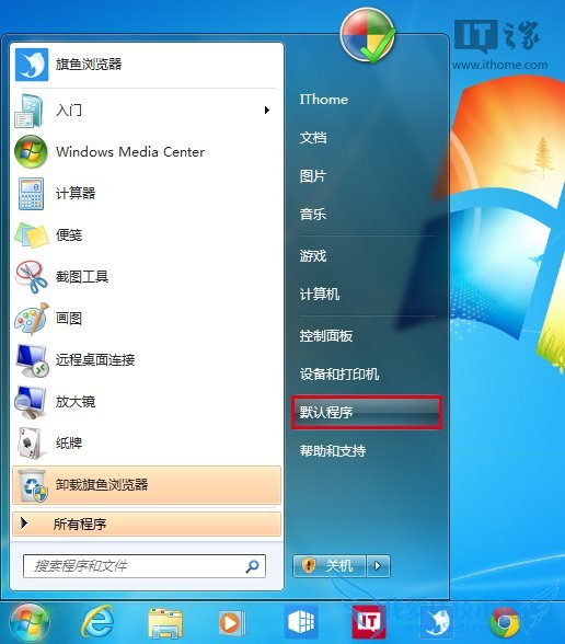 在Win7中,点击开始按钮→默认程序→设置默认程序,选择想要的浏览器后,点击“将此程序设置为默认值”,然后点击“确定”即可完成修改,如下图——