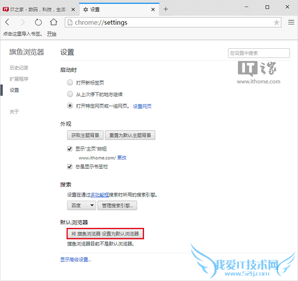 也可以进入浏览器设置页面进行手动设置,同样非常简单,下图以旗鱼浏览器电脑版(点击下载)为例——