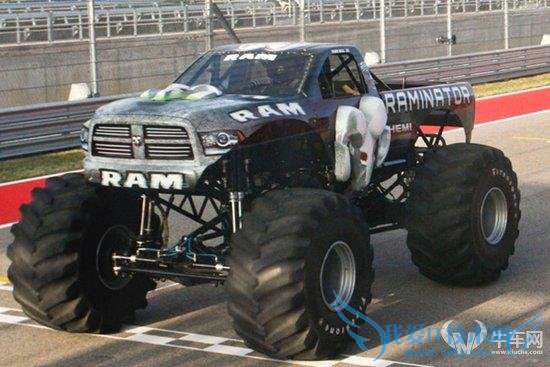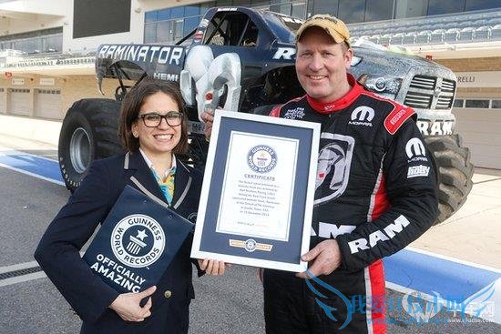 按理说,这种配备1.7米直径“bigfoot”,重量接近4吨半,并采用多连杆悬挂和四轮转向的monster truck本应该在黄土场地上压碎报废车来取悦观众,却那么任性地在得克萨斯州的3.4英里奥斯汀赛道玩儿起了“Drag Racing”。获得过Monster Truck Racing Association(MTRA) 全美大脚车联合会年度车手称号的Mark Hall驾驶套着道奇公羊皮卡车壳的monster truck以99.1英里/小时的速度打破了之前的96.8英里/小时的纪录,从而获得了新的吉尼斯世界纪录。