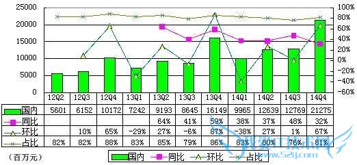 阿里集团第四季度来自于中国商业零售业务的营收为212.75亿元(约34.29亿美元),占据了总营收的82%,较上年同期的161.49亿元增长了32%。阿里集团第四季度来自中国商业零售业务的同比增长,主要受在线营销服务营收和佣金营收的增长推动。