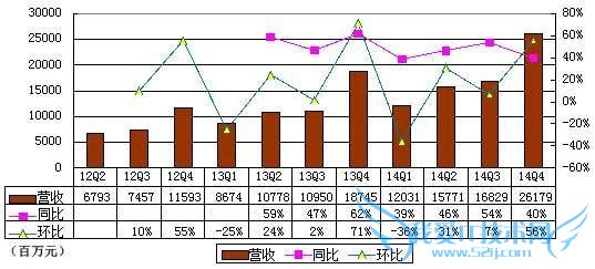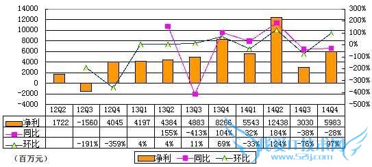 阿里集团第四季度利息和投资利润为3.13亿元(约合5100万美元),较上年同期的2.96亿元增长6%,这一增长主要是由于现金余额增加后带动利息利润增加,及2014年9月份进行首次公开募股产生收益增加,也受益于运营现金流的增加。
