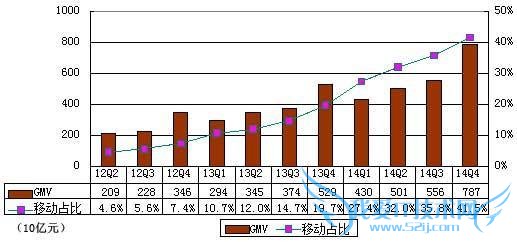 阿里集团第四季度来自于中国商业零售业务的移动营收达64.20亿元(约10.35亿美元),比去年同期的11.71亿元增长448%,约占第三财季整个中国商业零售业务营收总额的30%。