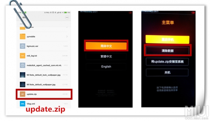 双清前要先备份好个人数据,不如清除后就没有了。首先给卡刷包改名,改成“update.zip”,记住后缀是".zip",改完名后放在手机“内置”存储,然后关机,手机在关机状态下同时按住"音量加"和"电源键"进入Rec(恢复模式),官方Rec操作方法:音量加减是选择键,电源键是确认。中间的图就是Rec主界面,这里选择简体中文(看得懂英文也可以选英文啦