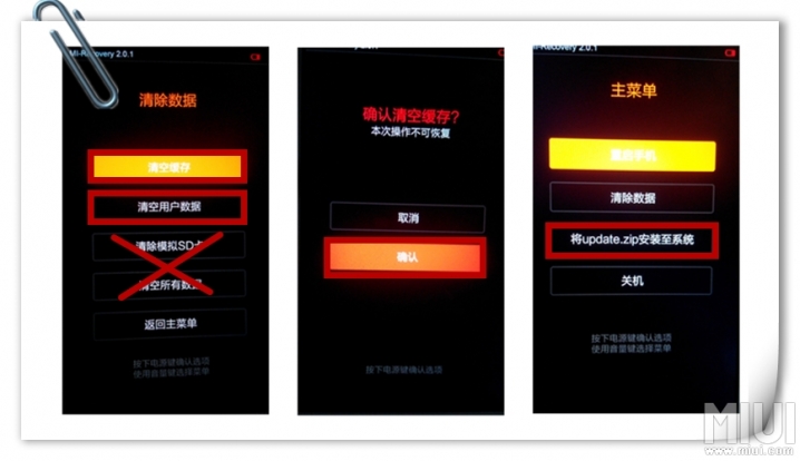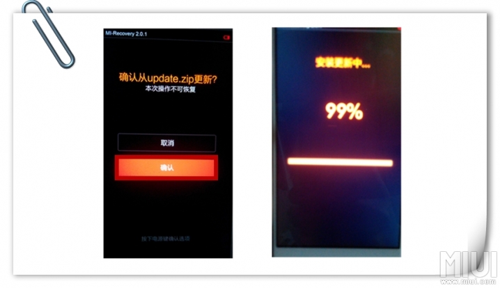 小结:这就是不双清卡刷的方法,但是要注意的是,只有安装比手机当前系统版本高的刷机包才不用双清,如果是降级或者系统有问题的还是看看双清的刷机方法吧。另外,红米系列选择刷机包后直接提示重启,然后在Rec里面自动完成刷机包的安装,小米系列(1,2,3,4)是在系统更新内完成安装然后直接重启进系统的,那是因为小米系列支持双系统。(红米手机1不适用)