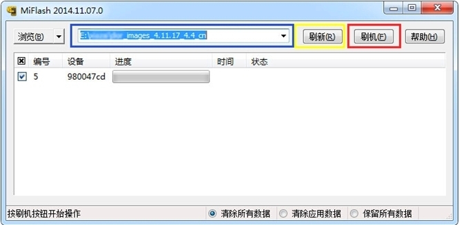 然后要到手机端操作了,手机关机状态下同时按住"音量减"加"电源键",会出现一只米兔和Fastboot字样,这里就进入到Fastboot模式了,接着手机用数据线连接到电脑,电脑端Miflash中点击”刷新“按钮,就会看到有一个设备在列表里面了,如下图: