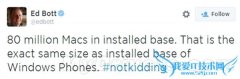 在今天的开发者大会上,苹果宣布自家Mac用户已经达到8000万台,并对微软Windows8.1大肆奚落一番。不过现在,已有外媒记者替微软发声,称WP用户也已经突破8000万。外...
